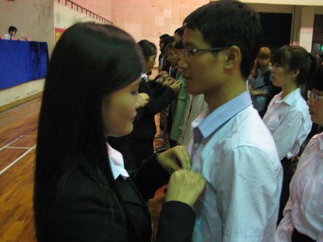 在佩戴校徽仪式上,学院老生代表身着象征着职业经理人的职业装,队伍整齐划一,面带笑容地为2013年专升本新生和2013级本科新生逐一佩戴校徽。“学弟(妹)好”、“新葡的京集团350vip欢迎你”、“希望我们成为朋友”,老生一句句温馨的话语,让新生倍感温暖。戴上校徽的那一刻,新生倍感自豪,也在心中铭刻下了“以人名校、以业报国”的校训。老生为新生佩戴校徽,不仅体现了老生对新生的热烈欢迎,更加体现了学院文化的传承和发扬。