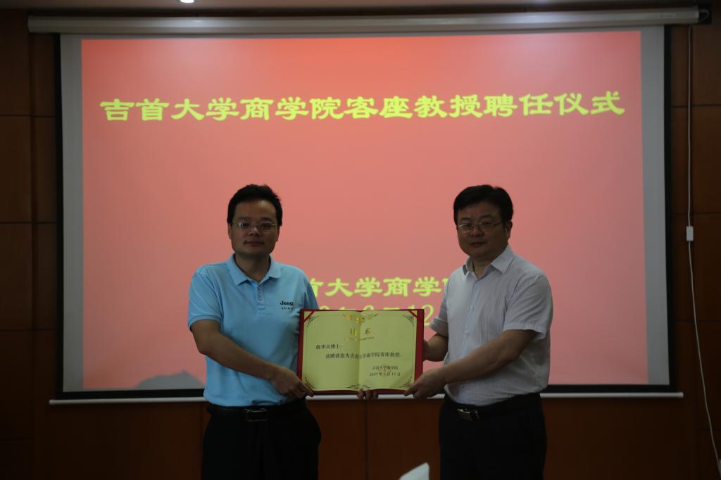 6月12日上午,学院在院会议室举行客座教授聘任仪式,聘任湘西经济开发区党工委委员、管委会副主任敬华兵博士为学院客座教授。湘西经济开发区党工委委员、管委会副主任皮丕军,湘西经济开发区文化教育和卫生局副局长向大海,新葡的京集团350vip党委委员、副校长冷志明,院党委书记黎克双,院长丁建军参加了聘任仪式,仪式由副院长龙海军主持。